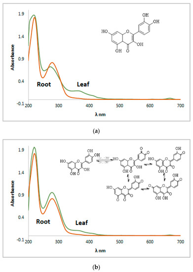 Electrochemical investigations of both N. alba extracts (1 mg/mL in methanol) were performed using cycling voltammetry and UV-Vis spectroscopy. Samples showed light positive potential from the open circuit potential measurements, with the leaf extract presenting a potential about 30 mV more positive when compared to the root extract. The cyclic voltammograms of the root extract revealed moderate electrochemical activity compared with those obtained from the leaf extract. The N. alba extracts exhibited an intensity of anodic current (Ipa) up to 10.20 μA for the leaf extract and up to 6.32 μA for the root extract. The quercetin (10−3 M), as the major antioxidant compound, showed similar voltammogram profile as in the N. alba extracts (Figure 9a, blue line). The E1/2 of leaf and root extracts was 0.410 V ± 10 mV compared with the quercetin potential [58].