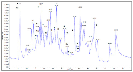 The LC-MS/MS chromatographic separation of the methanolic N. alba leaf extract (H-HHDP-hexoside, Qu–quinic acid, C–corilagin, V–vanillic acid, Cas–castalin, Ga–gallic acid, G–geraniin, Ca–caffeic acid, p-C–coumaric acid, T–tannic acid, R–rutin, El–ellagic acid, Elr–ellagic rhamnosyl acid, Elp–ellagic pentoside acid, Cn–cinnamic acid derivative, Na–naringenin, N–naringin, Ch–catechin, Ep–epicatechin, Cl–chlorogenic acid, Q–quercetin, L–luteolin, B–brevifolin, O–orientin).