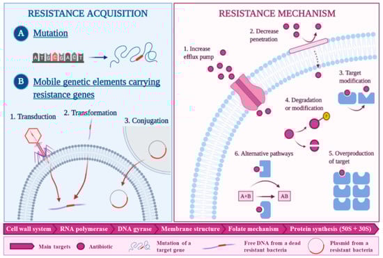 Summary of the resistance acquisition pathways: Mutation and mobile genetic elements: By transduction, transformation or conjugation. Schema of the six main mechanisms of antibiotics resistance. Modified from [,,].