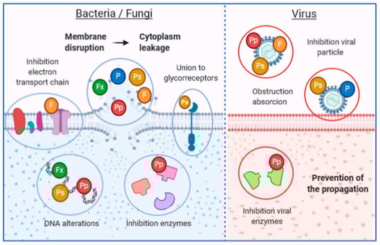 The antimicrobial properties of macroalgae polysaccharides are attributed to the interaction between glyco-receptors of the bacterial cell wall, compounds of the membrane and nucleic acids and the polysaccharides. Those interactions lead to the disruption of the membrane stability and cellular functions []. Several factors have been shown to influence this activity, such as the molecular weight, charge density, structure and conformation []. Sulfated polysaccharides have demonstrated their antibacterial activity in several studies. For example, depolymerized fucoidans of L. japonica showed antibacterial activity against E. coli and S. aureus, which is caused by the interaction of fucoidans with membrane proteins, leading to membrane rupture and further cell death []. In other study, sulfated polysaccharides were extracted from different marine macroalgae and their antibacterial and antibiofilm properties were assessed against dental plaque bacteria. Fucoidan extracted from F. vesiculosus inhibited the mentioned bacteria and foodborne pathogens. In this case, the results suggest that fucoidan may not present a direct killing effect and may act by trapping nutrients, reducing the bioavailability []. To our knowledge, few studies have evaluated the antifungal properties and mechanisms of algal polysaccharides. Water soluble polysaccharides extracted from P. capillacea and D. membranacea displayed antifungal activity against different yeast and fungi. P. capillacea inhibited the growth of F. oxysporium, while D. membranacea inhibited C. albicans and M. phaseli. In future studies, it is expected that the compounds involved in this activity, as well as their mechanisms of action will be identified []. Regarding antiviral effects, these have been studied more extensively. Macroalgal polysaccharides can inhibit the multiplication of viruses such as the herpes simplex virus (HSV), human immunodeficiency virus (HIV) or the dengue virus. They can also obstruct the interaction between viruses and cells and inhibit enzymes []