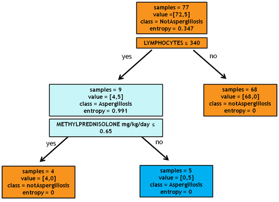 Precisely, the algorithm processes the database containing all patients with influenza through a progressive sequence of tests. These tests, with a positive or negative outcome for the categorical variable and greater or smaller than a given threshold for the continuous variables, were performed by the algorithm on all the instances in the database. Subsequently, we asked the algorithm to provide the variables that split the samples into classes (IPA and non-IPA). For our specific cohort, as the first test, the algorithm selected the variable lymphocytes ≤340/µL; this variable divides the root (i.e., the set of all patients) into two leaves: a pure leaf, patients with lymphocytes more than 340/µL, consisting of 68 all non-IPA patients, and an impure leaf, patients with lymphocytes less than 340/µL, consisting of 4 non-IPA patients and 5 IPA patients. Then, we asked the algorithm to choose a new test, namely the variable that most divided IPA from non-IPA patients among this population of 9 subjects. The algorithm identified the administration of methylprednisolone at a dosage greater than 0.65 mg/kg/day. Eventually, we obtained two pure leaves: one containing the 4 patients taking less than 0.65 mg/kg/day, none of which were affected by IPA, and one containing 5 patients taking more than 0.65 mg/kg/day, all with the diagnosis of IPA. The new cases of influenza will be processed with the built model to predict the probability of developing aspergillosis as follows: the patient will be tested according to the sequence of questions identified by the tree and eventually lie in a leaf that will determine the class (IPA or non-IPA). Other statistical analyses were performed using Microsoft Excel (Office 2019) or Statistical Program for the Social Sciences (SPSS) version 20. To assess the normal distribution, the coefficients of kurtosis, skewness, and histogram plots were used. The data, unless otherwise stated, were reported as median with interquartile range (IQR: 25th and 75th percentile) for continuous variables and as simple frequencies (n) and proportions (or percentages) for dichotomous variables. Group comparisons in univariate analysis were made using the Mann–Whitney or Kruskal–Wallis tests for continuous variables. The Fisher’s exact or Chi-square tests were used as appropriate to test group differences of proportions. Lastly, parameters that were statistically significant in a univariate way were used in the logistic regression analysis to estimate adjusted odds ratios (ORs) and 95% confidence intervals (95% CI) for the risk factors associated with the development of IPA, including the confounding factors (age, gender, etc.). A p-value of less than 0.05 was considered statistically significant.