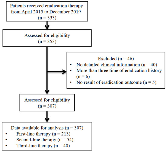 Of a total of 353 H. pylori-positive patients treated eradication therapy at Shiga University of Medical Science Hospital from April 2015 to December 2019, we excluded 46 patients who had no result of eradication outcome (n = 5), no detailed clinical information including CYP2C19 genotype (n = 40) and had more than three time of eradication history (n = 6) (Figure 1). Of the remaining 307 patients, 213 had no prior eradication history, 54 had undergone one course of eradication treatment (PPI or vonoprazan with clarithromycin and amoxicillin), and 40 had undergone two courses (PPI or vonoprazan with clarithromycin and amoxicillin as first-line treatment and PPI or vonoprazan with metronidazole and amoxicillin as second-line treatment). There were no significant differences in age, sex, body weight, height, or history of smoking and drinking among the first-, second-, and third-line treatment groups (Table 1).