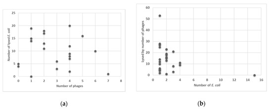 Ability of phages to lyse none, one, or more E. coli (y-axis) (a) and susceptibility of the E. coli isolates to be lysed by none, one, or more of the 60 phages (y-axis) (b).
