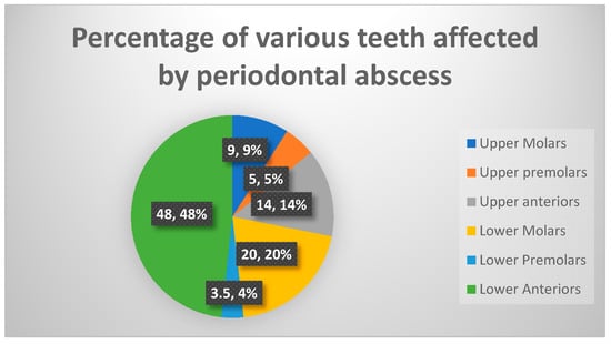 In this study, lower incisors were found to be the most commonly affected teeth. Our findings agree with the results of another study [] with slightly larger sample size. However, in another study molar teeth were reported to be the most commonly affected by periodontal abscess [].