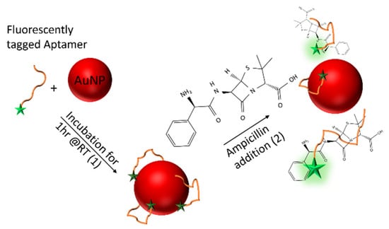 Recently, an aptameric based assay has been developed by Song et al. for the quantification of ampicillin in heavily processed milk in the agricultural industry using the first aptamer reported for ampicillin detection [4]. The assay combined fluorescently-labelled aptamers specific to ampicillin that was non-specifically bound to gold nanoparticles (AuNPs) that acted as a quencher for the fluorescent tag. In the presence of ampicillin, the aptamer dissociates from the AuNPs, resulting in a fluorescent readout and subsequent aggregation of the gold nanoparticles, Figure 1. The assay was demonstrated using processed milk as a sample matrix, that was buffered to pH 8 where the signal of the fluorescent tag was optimal and diluted to minimise potentially interfering components in the milk that otherwise induced nanoparticle aggregation. While the assay is suitable for use in an agricultural setting, the requirement to heavily dilute and buffer the sample would limit its use and its adaptability for use in other settings.