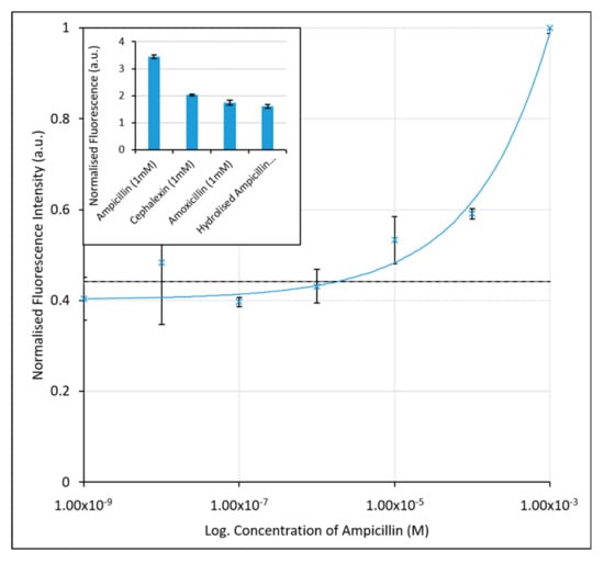 Calibration graph for the determination of ampicillin in KPi Buffer using the initial FAM-labelled aptamer assay. An increase in fluorescence is seen with increasing ampicillin concentration due to desorption of aptamers from the nanoparticle surface. The black, dashed line (at 3.75 µM) corresponds to the limit of detection for the assay. Inset: Fluorescence intensities (λex = 487 nm and λem = 528 nm) of ampicillin, cephalexin and amoxicillin samples at 1 mM concentrations, indicating the aptamers selectivity for ampicillin over similarly structured β-lactamase molecules, and the hydrolysed form of ampicillin. The error bars represent a single standard deviation from the mean. R2 value of fitted line is 0.9848.