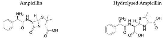 The chemical structures of ampicillin and its hydrolysed form resulting from the enzymatic cleavage of the β-lactam ring structure.