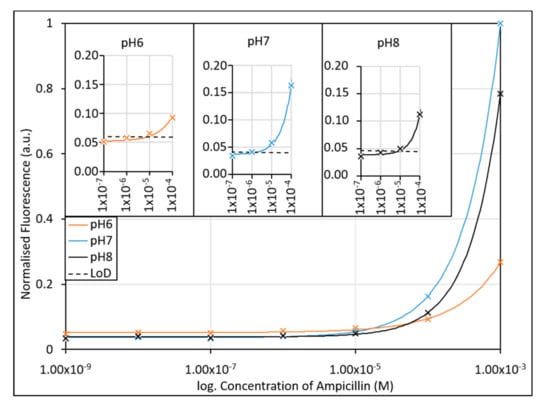 The effect of pH on the ampicillin aptamer assay was investigated using potassium phosphate buffers with pH’s over the expected clinical range (pH 6–8). Due to the fluorescence tag employed, the assays were expected to respond most effectively at neutral pH (pH 7), with a decrease in response to the presence of ampicillin seen at pH 8 and pH 6. Inset: Limits of detection of the assay when performed in different pH buffers. The lowest LoD (2.18 µM) was found to occur at pH 7. R2 values of fitted lines are 0.9984, 0.9999, and 0.9999 for pH6, pH7 and pH8, respectively.