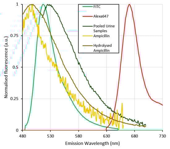 Development of a test that works in unprocessed urine samples necessitates a change of the fluorescent label not only due to the pH sensitivity of the label but also the intrinsic fluorescence exhibited by urine. This intrinsic fluorescence significantly overlaps that of the fluorescein based fluorescent tags used in the previous work. The fluorescence of urine is due to the presence of flavins, which are normally found in urine at low concentrations in healthy patients and exhibit a fluorescence emission at approximately 520 nm [58]. As shown in Figure 5, the fluorescence of urine overlaps spectrally with that of FAM but not Alexafluor647. The problem of spectral overlap is further exacerbated by the presence of any hydrolysed ampicillin within the sample. While the aptamer-based assay itself demonstrates some selectivity between hydrolysed and non-hydrolysed ampicillin, both ampicillin and its hydrolysed products display an intrinsic fluorescence, which—depending on the concentration—can interfere with that of the FAM label. β-Lactam antibiotics are readily hydrolysed by β-lactamase enzymes, which are one of the main modes of resistance in drug resistant UTI’s [5,59]. β-Lactamase enzymes catalyse the hydrolysis of the β-lactam ring structure resulting in the deactivation of the antibiotic, and a change in the fluorescence spectrum.