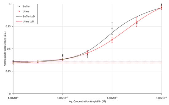 Both the buffer and urine assay results show the standard assay response curve expected for biochemical based assays, with the gradient of the slope maximised over the expected clinical range for ampicillin concentrations in urine (100 nM to 100 µM) [60]. The urine-based assay shows only a slight drop in fluorescence emission compared to that performed in buffer, presumably due to scattering of the light in the urine matrix. The LoD, calculated from the minimum concentration of ampicillin measured and its standard deviation, were found to be 43.8 nM and 20.6 nM for the buffer and urine sample matrices, respectively. These LoD values suggest that the assay is suitable for use over the desired clinical range. Typically, the maximum concentration of antibiotics in human urine is around 80 to 115 μg/mL (236 to 322 µM), dependent on the age and health of the patient [60]. The assay would further prove suitable for monitoring of ampicillin levels used in veterinary practices where ampicillin levels in urine excretions have been measured to be 309 ± 55 μg/mL (approx. 0.8 mM) after 8 h in dogs [61]. Control assays can be found in the Supplementary Materials, Figures S8 and S9.
