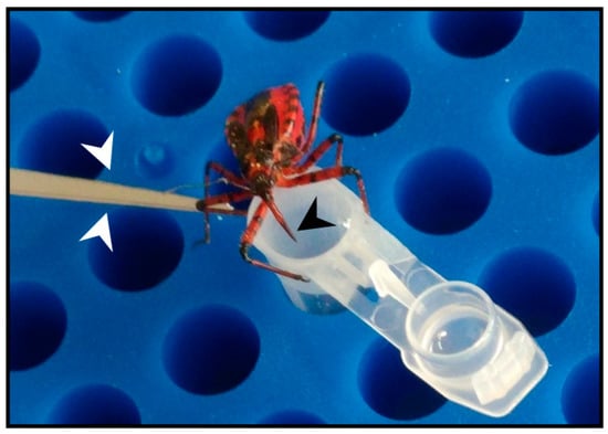 The European predatory assassin bug Rhynocoris iracundus. Stimulation of R. iracundus on the hind legs using entomological forceps (white arrow heads) encourages the insect to use its proboscis (black arrow head) to inject venom through laboratory film (Parafilm) stretched over a collection tube containing phosphate-buffered saline (PBS).
