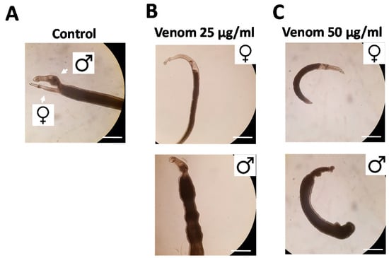 Rhynocoris iracundus venom affects the vitality of Schistosoma mansoni. Worm pairs were treated with different concentrations of venom (25 or 50 µg/mL). Representative images show worms after 72 h. (A) Untreated control worms remained paired and attached via their suckers to the base of the culture plate. The addition of venom at (B) 25 µg/mL or (C) 50 µg/mL induced the separation of pairs and detachment from the plate. Scale bars = 250 µm.