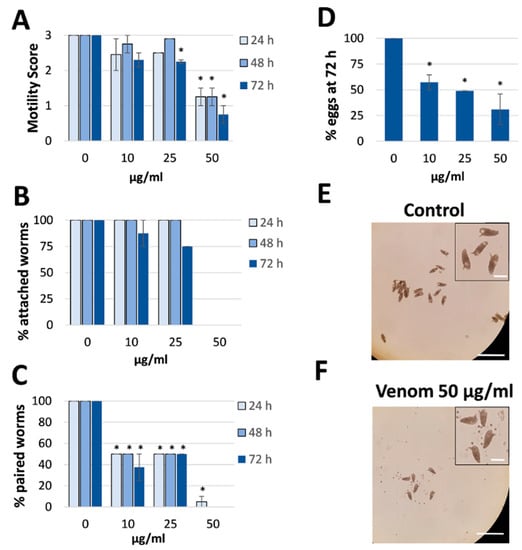 Effect of Rhynocoris iracundus venom on Schistosoma mansoni motility, pairing and egg production. Worm pairs were treated with different concentrations of venom (10–50 µg/mL) for a period of 72 h. We measured (A) motility, (B) the percentage of worms attached to the base of the plate, and (C) pairing stability every 24 h. (D) The number of eggs produced within 72 h relative to the untreated control. The shape of the eggs appeared normal after venom treatment (inserts). Graphs show a summary of two experiments with 5–8 worm pairs (mean ± SEM). Significant differences vs. the control are indicated (* p < 0.05, Wilcoxon rank sum test). (E,F) Representative images showing the number of eggs produced by untreated control worms and venom-treated worms (50 µg/mL). Scale bars = 250 µm, for inserts = 60 µm.
