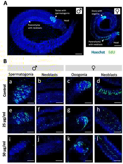 Effect of Rhynocoris iracundus venom on the proliferation of Schistosoma mansoni stem cells. (A) Overview of the location of parenchymal stem cells (neoblasts) and gonadal stem cells (spermatogonia and oogonia) in male and female worms. Stem cells are labeled with EdU (green), and nuclei are counterstained with Hoechst 33342 (blue). Scale bars = 100 µm. (B) Worm pairs were treated for 72 h with 25 or 50 µg/mL of venom or cultured without venom as a control. EdU was added during the final 24-h period. The abundance of EdU-positive proliferating stem cells was comparable in worms of the control group (a–d) and those treated with 25 µg/mL of venom (e–h) whereas 50 µg/mL of venom reduced the number of proliferating stem cells in males (i, j) but not in females (k, l). Scale bars = 50 µm. Representative images of four worms per treatment group are shown.