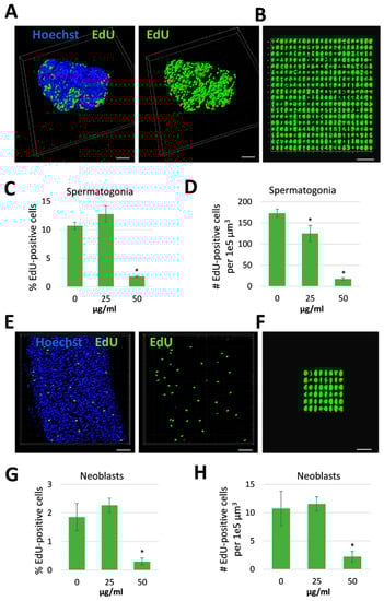 Antischistosomal effects may be associated with a decrease in the number of proliferating stem cells [29], which are considered essential for parasite development and survival [30]. We therefore investigated whether R. iracundus venom had a similar effect. Because stem cells are the only proliferating cells in adult schistosomes [31], we made use of the thymidine analog EdU (5-ethynyl-2-deoxyuridine) in order to visualize proliferating stem cells in whole-mount worms. EdU-positive stem cells were observed throughout the parenchyma of male and female worms (Figure 4A). These are known as neoblasts and have been shown to provide a constant stream of new cells for the development of the tegument, gastrodermis and potentially other tissues [31]. EdU-positive stem cells were also abundant in the gonads: spermatogonia in testes and oogonia in the ovary (Figure 4A), which give rise to germ cells. The analysis of venom-treated female worms by confocal laser scanning microscopy (CLSM) revealed no obvious change in the number of EdU-positive stem cells compared to untreated controls. However, the number of proliferating stem cells in males treated with 50 µg/mL venom fell to near zero in both the parenchyma and gonads (Figure 4B). To quantify this effect, we performed 3D image analysis to determine the numbers of EdU-positive stem cells and of Hoechst-positive total cells in the testes (Figure 5A–D) and the parenchyma (Figure 5E–H). This revealed a significant reduction in the frequency of stem cells and of the density of stem cells per defined tissue volume with 50 µg/mL venom. This was observed for both, spermatogonial stem cells (Figure 5C,D) and parenchymatic neoblasts (Figure 5G,H).