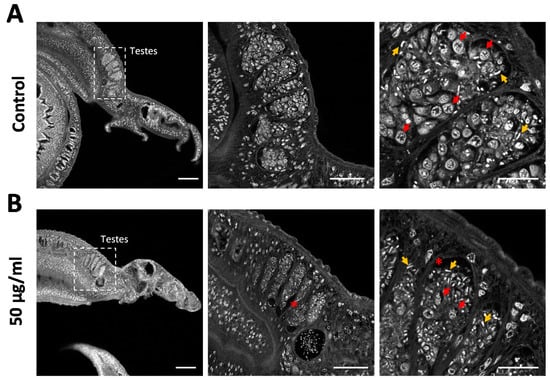 Rhynocoris iracundus venom reduces the number of spermatogonia in the testes of Schistosoma mansoni. Pairs of worms were treated with 50 µg/mL of venom for 72 h and males were stained with carmine red to reveal morphological details. (A) Control males feature typically pronounced testicular lobes filled with large spermatogonia (red arrows show examples) and different stages of maturing cells. Mature spermatozoa appear as small white comma-shaped cells (yellow arrows). (B) Testicular lobes in venom-treated males appear shrunken, include atypical cell-free areas (marked with *), and lack most of the spermatogonia, whereas mature spermatozoa are still present. The remaining spermatogonia show evidence of intracellular degradation. Scale bars = 100 µm (left), 50 µm (center), 20 µm (right).