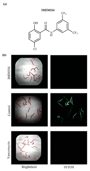 We identified the NF-κB inhibitor IMD0354 (Figure 1a) as a hit compound that impedes C. elegans from an MSRA infection (Figure 1b). This compound completely protected all 15 C. elegans worms from the MRSA infection at 7.14 µg/mL (Figure 1b). Upon further evaluation, we determined the protection mechanism by which IMD0354 functioned was direct antimicrobial activity against MRSA MW2 with a MIC of 0.06 µg/mL. Although IMD0354 has been known to have multiple bioactivities, such as anti-cancer, anti-inflammatory, and anti-viral activity [,,], its direct antimicrobial activity has not been reported. Therefore, we focused on evaluating the potential of repurposing IMD0354 as an antimicrobial agent.