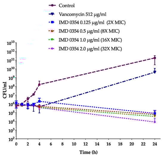 We then evaluated whether IMD0354 is bacteriostatic or bactericidal and found that IMD0354 is bacteriostatic to eight VISA strains (MBC/MIC ratio > 4) and bactericidal (MBC/MIC ratio ≤ 4) to six VISA strains (Table 2). Additionally, IMD0354 is bacteriostatic to a VRSA strain, VRS1, and all VRE strains tested (Table 2 and Table 3). These results were further confirmed by time-course killing kinetics of VRS1 cells treated with IMD0354 at 0.125 µg/mL (2× MIC), 0.5 µg/mL (8× MIC), 1 µg/mL (16× MIC), and 2 µg/mL (32× MIC) for up to 24 h (Figure 2). We found that IMD0354 was able to reduce colony forming units per mL (CFU/mL) by approximately 1 log in 24 h at a level of 8× to 16× MIC and up to 1.5 log at 32× MIC (Figure 2). However, vancomycin alone did not inhibit the bacterial growth of VRS1 [] even at high concentrations such as 512 µg/mL (Figure 2).