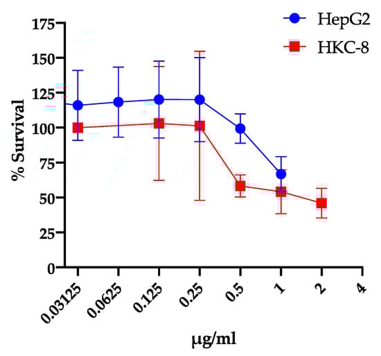 Two-fold concentration drug plates were prepared using Dulbecco’s Modified Eagle’s medium (DMEM) with 10% FBS. HepG2 or HKC-8 cells were grown in DMEM 10% FBS to confluency and seeded onto 96-well drug plates at 1.0 × 106 cells/mL and 0.4 × 106 cells/mL, respectively. Drug and cell plate were then incubated for 22 h at 37 °C and 5% CO2. At 22 h, 10 µL of WST-1 (Roche, Sigma) was added to each well, following manufacturer’s directions, and incubated for an additional 2 h. Plate absorbance was read at 450 nm. Samples were normalized to a non-treatment control. All experiments were conducted in triplicate.