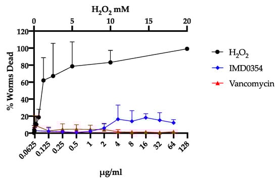 IMD0354 shows minimal toxicity toward C. elegans. Survival of C. elegans treated with various concentrations of IMD0354, normalized to C. elegans treated with DMSO. H2O2 was used as positive control. (n = 3, ± S.D). Bottom error bars are omitted for clarity.