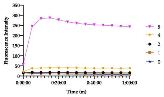 These studies were conducted as previously described in Kim et al. 2018 []. In brief, black, clear-bottom, 96-well plates (Corning no. 3904, Corning, NY, USA) were filled with 50 μL of PBS (pH: 7.4) containing 2× the indicated concentration of antibiotics. Stationary-phase VRS1 cells prepared as described in the antibiotic-tolerant cell killing assay were washed 3 times with equal volumes of PBS. Washed cells were then adjusted to OD600 0.4 (~2 × 107 CFU/mL) with PBS. SYTOX Green (Molecular Probes, Waltham, MA, USA) was added to 10 mL of the diluted bacterial suspension to a final concentration of 5 μM and incubated for 30 min at room temperature in the dark. 50 μL of the bacteria/SYTOX Green mixture was added to each well of the 96-well plates containing antibiotics. Fluorescence was measured at room temperature using a spectrophotometer (SpectraMax M2, Molecular Devices, Sunnyvale, CA, USA), with excitation and emission wavelengths of 485 nm and 525 nm, respectively. All experiments were conducted in triplicate.