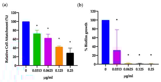 Biofilms are resistant to antibiotic treatment and are responsible for various chronic and recalcitrant infections []. Cell attachment is the initial stage of biofilm formation and development and is the main target in one of the principle strategies of biofilm management [,]. Therefore, it is clinically relevant to identify agents that inhibit biofilms during this critical step of initiation. Currently, there are already methods used to inhibit initial biofilm formation such as host-derived glycoproteinaceous film coating of medical implants and devices []. Likewise, molecular compounds such as aryl rhodanines or calcium chelators have also shown some success at inhibiting biofilm initial cell attachment []. To test the inhibitory activity of IMD0354 on biofilm initial cell attachment, we incubated a high density of VRSA strain VRS1 bacterial culture (~8 × 107 CFU/mL) with various concentrations of IMD0354 (Figure 7) for 1 h and measured cell attachment using XTT (2–3-bis(2-methyloxy-4-nitro-5- sulfophenyl)-2H-tertazolium-5-carboxanilide) fluorescent dye. We found that IMD0354 is indeed able to block biofilm initial cell attachment in a dose-dependent manner with a greater than 60% inhibition at 4× MIC (0.25 µg/mL, (* p = 0.0059) (Figure 7a). Furthermore, we argue that the reduction in initial cell attachment is not due to antimicrobial activity given that we show that IMD0354 does not reduce cell viability after 1 h of incubation (Figure 2). To support these findings, we tested whether IMD0354 inhibits mature biofilm formation at concentrations which showed reduced initial cell attachment. As expected, we found that IMD0354 can completely inhibit biofilm formation beginning at a MIC concentration of 0.06 µg/mL (* p = 0.0005) with >50% inhibition at a sub-MIC concentration of 0.0313 µg/mL (* p = 0.0077). However, given that we showed that IMD0354 was unable to fully inhibit biofilm initial cell attachment but was still able to disrupt biofilm formation, we speculate that the inhibition of initial cell attachment is not the sole mechanism by which IMD0354 can hinder biofilm formation. Our working hypothesis is that the effect IMD0354 has on biofilm formation is due to the combined activity the compound has on bacterial growth and its ability to impede initial cell attachment. Furthermore, IMD0354 is unable to eradicate fully mature biofilm once established (data not shown).