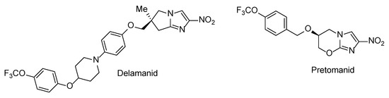 Clinically approved drugs delamanid and pretomanid.