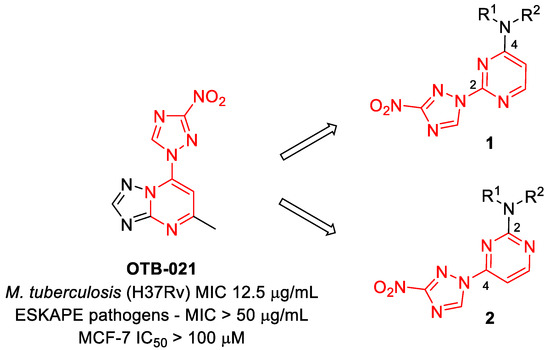 In our program aimed at discovering new efficacious antibacterial leads, we undertook screening of a set of diverse nitrogen heteroaromatic compounds bearing a bioreducible nitro group. From this effort, compound OTB-021 (5-methyl-7-(3-nitro-1,2,4-triazol-1-yl)-1,2,4-triazolo[1,5-a]pyrimidine) surfaced as a moderately potent hit with specific activity against drug-sensitive H37Rv strain of Mycobacterium tuberculosis [14], while other Gram-positive (S. aureus and E. faecium) or Gram-negative (E. coli, P. aeruginosa, A. baumannii, K. pneumoniae) pathogens belonging to the so-called ESKAPE panel [15] and immortalized cancer cell lines (MCF-7, FS4-LTM, KB-3-1, L929) were not affected. We hypothesized that the 4-(3-nitro-[1,2,4]-triazol-1-yl)pyrimidine portion of OTB-021 (highlighted in red) was likely responsible for its antibacterial properties, and we sought to verify this premise by simplifying the structure of this hit molecule, making it more amenable to structural variations and investigating the structure–activity relationships (SAR). To this end, we designed two isomeric series, -2- and 4-(3-nitro-1,2,4-triazol-1-yl)pyrimidines 1 and 2, bearing diverse amino side chains in positions 4 and 2 of the pyrimidine ring, respectively. The principal idea behind such a design was to reduce the bicyclic aromatic nitrogen-rich core of OTB-021 to the more druglike pyrimidine as well as to provide sufficient room for structural diversity via the side chain variation (Figure 2). Herein, we report the synthesis and comparative evaluation of the two novel series of compounds with respect to their ability to inhibit the growth of bacterial pathogens.