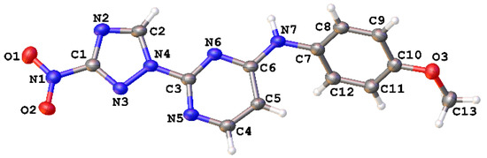 A glass screw-capped vial containing a magnetic stir bar was charged with 2-chloro-4-(3-nitro-1H-1,2,4-triazol-1-yl)pyrimidine (5, 0.44 mmol, 100 mg), 4-methoxyaniline (1.32 mmol, 163 mg) and DMSO (2 mL). The reaction mixture was stirred at 100 °C for 3 h. The reaction mixture was poured into water (10 mL) and cooled in a refrigerator. The resulting precipitate was filtered off and additionally crystallized from 96% ethanol to afford the title compound. Orange solid, yield 41%; mp 236–238 °C (decomp.). 1H NMR (500 MHz, DMSO-d6) δ 9.71 (s, 1H, NH), 9.46 (s, 1H, triazole), 8.70 (d, J = 5.2 Hz, 1H, HAr), 7.74–7.59 (m, 2H, HAr), 7.23 (d, J = 5.2 Hz, 1H, HAr), 7.04–6.87 (m, 2H, HAr), 3.78 (s, 3H, CH3). 13C NMR (101 MHz, DMSO-d6) δ 163.3, 162.7, 160.0, 155.4, 154.9, 145.4, 132.8, 121.8, 114.4, 99.6, 55.6. HRMS-ESI (m/z): calcd for C13H11N7O3Ag [M + Ag]: 419.9969, 421.9966; found: 419.9987, 421.9984.