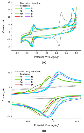 Cyclic voltammograms for compounds 1i, 1j, 1m, 1n, 2b, 2e, 2i and 2r obtained relative to the ferrocene standard: (A) full view, (B) redox wave close-up.