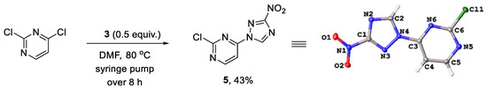 We reasoned that the seemingly unavoidable formation of disubstituted product 4 in reactions of 3 with 2,4-dichloropyrimidine could be circumvented if excess of the latter was used while the concentration of 3 was maintained low over the course of the reaction. After substantial experimentation, we established that with 0.5 equiv. of 3 added as a DMF solution to a solution of 2,4-dichloropyrimidine in DMF using a syringe pump over 8 h (at a rate of about 0.82 mmol in 2.5 mL per hour) at 80 °C, monosubstituted 2-chloro-4-(3-nitro-1H-1,2,4-triazol-1-yl)pyrimidine (5) could be obtained in 43% yield (from 3), while unreacted 2,4-dichloropyrimidine could be isolated and utilized again. The substitution pattern of 5 was confirmed by the single-crystal X-ray analysis (Scheme 2, Table S1).