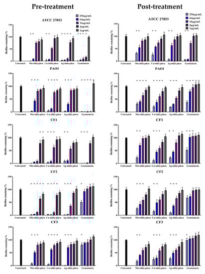 - Viganor, L.; Galdino, A.C.M.; Nunes, A.P.F.; Santos, K.R.N.; Branquinha, M.H.; Devereux, M.; Kellett, A.; McCann, M.; Santos, A.L.S. Anti-Pseudomonas aeruginosa activity of 1,10-phenanthroline-based drugs against both planktonic- and biofilm-growing cells. J. Antimicrob. Chemother. 2016, 71, 128–134. [Google Scholar] [CrossRef]