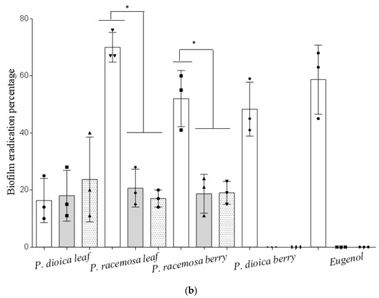 | P. dioicaberry * | More than 41.4 µg·mL−1 | More than 8× MIC |