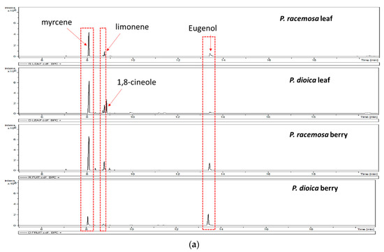 | P. racemosa Leaf | P. dioica Leaf | P. racemosa Berry | P. dioica Berry | ||||