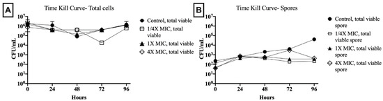 Time-kill studies illustrate the (A) total vial cell and (B) total viable spore concentrations over 96-h in the presence of varying manuka honey concentrations (1/4×, 1×, and 4× the MIC) and honey-free control. Abbreviations: CFU, colony-forming units; MIC, minimal inhibitory concentration.