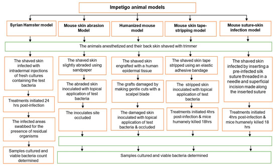 Although the results generated from animal models can and do provide a degree of clinical predictivity and are the best preliminary screening methods to select new antimicrobial agents or therapies for clinical trials, they cannot be directly translated to humans and the final judgment of an antimicrobial agent’s efficacy is ultimately dependent on the results of controlled clinical trials [21,22,26,28,29]. Over the years, several models of skin infection have been developed with considerable success in reproducing the pathogenesis of S. aureus and GAS diseases and are currently being used to study skin and soft tissue infections (SSTI) caused by these bacteria [30,34,36,37,38]. The experimental details of these models have been extensively summarized in a number of reviews [30,36,37,39]. However, the same cannot be said for impetigo at present, and there is a lack of a comprehensive review on the animal models investigated for impetigo. Here, we critically review the animal models investigated to mimic clinical impetigo and discuss their methodology, strengths, limitations, and the rationale for their application in evaluating impetigo drug candidates.