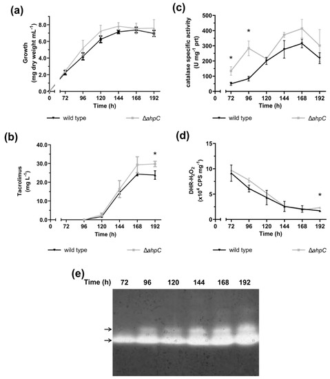 Characterization of S. tsukubaensis wild type (black lines) and ∆ahpC (grey lines) cultures grown in MGm-2.5 medium: (a) growth curve; (b) tacrolimus production; (c) catalase specific activity and (d) intracellular H2O2 levels. Vertical bars indicate standard deviation of the mean values; * indicates significant differences between wild type and ∆ahpC, p < 0,05 (t-test with Holm-Sidak correction for multiple comparison). Results are the average of at least three independent experiments. (e) Native-PAGE of S. tsukubaensis cell extracts (30 µg total protein per lane) stained for catalase activity. Arrows indicate the two bands that display catalase activity.
