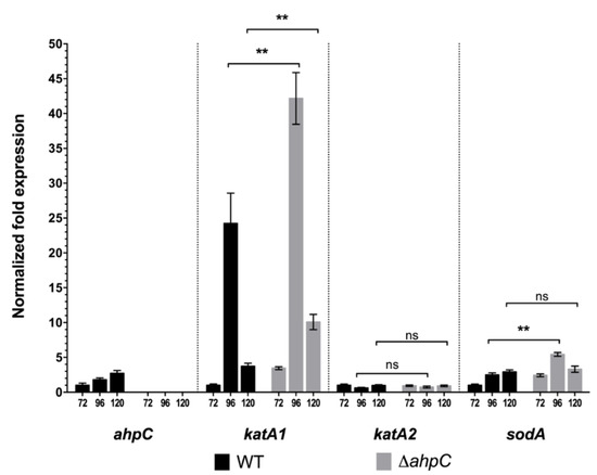 RT-qPCR gene expression analysis of antioxidant encoding genes in S. tsukubaensis wild type (black bars) and ∆ahpC strain (grey bars) grown in MGm-2.5 medium. The mean normalized fold expression (±standard errors) of genes ahpC (STSU_11585), katA1 (STSU_10876), katA2 (STSU_11535) and sodA (STSU_24238) at 72 h, 96 h and 120 h of growth was calculated relative to the transcription of the reference genes rpsP (STSU_08694) and hrdB (M value 0.4432) and the reaction of internal normalization was performed using the wild type at 72 h as the control situation. Statistically significant differences: ** p < 0.01; ns—not significant.