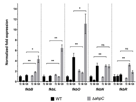 Gene expression analysis of selected genes of the tacrolimus biosynthetic gene cluster in S. tsukubaensis wild type (black bars) and ∆ahpC strain (grey bars) grown in MGm-2.5 medium. The mean normalized fold expression (±standard errors) of genes fkbB, fkbL, fkbO, fkbN and fkbR at 72 h, 96 h and 120 h of growth was calculated relative to the transcription of the reference genes (STSU_08694 and hrdB–M value 0.4432) and the reaction of internal normalization was performed using the wild type at 72h as the control situation. Statistically significant differences: * p < 0.05; ** p < 0.01; ns—not significant.