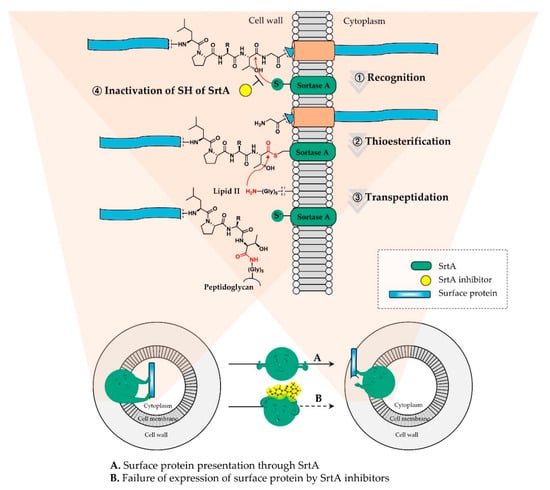 Mode of action of SrtA and its inactivation through its inhibitor; the surface proteins are covalently attached to the cell wall peptidoglycan with the aid of SrtA via the following sequential steps: (1) recognition, (2) thioesterification, and (3) transpeptidation. Further, they are inhibited for display, resulting in failure of adhesion to specific organ tissues, invasion of host cells, or the evasion of host-immune responses (4).