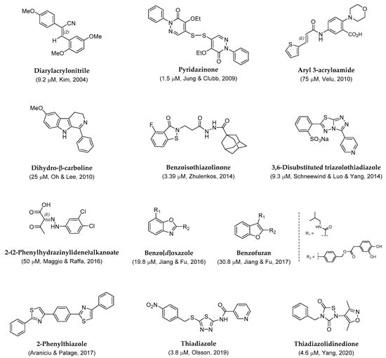 To explore the practicality of sortase A inhibitors, high-throughput screening (HTS) has been preliminarily adopted for constructive syntheses. In addition, further structural modifications through structure–activity relationship analysis have been performed to identify potential skeletons and functionalities. Several significant small organic molecules have been designed and synthesized, as shown in Figure 2, with promising IC50 values. Herein, the concrete synthetic features and the analytic properties for structural identification are described in the order of diarylacrylonitriles [], pyridazinones [], aryl 3-acryloamides [], dihydro-β-carboline [], benzisothiazolinones [], triazolothiadiazoles [], 2-(2-phenylhydrazinylidene)alkanoates [], 2-phenyl-benzo[d]oxazole-7-carboxamide [], 2-phenyl-benzofuran-7-carboxamide [], 2-phenylthiazoles [], 2, 5-disubstitued thiadiazole [], and thiadiazolidinedione [].