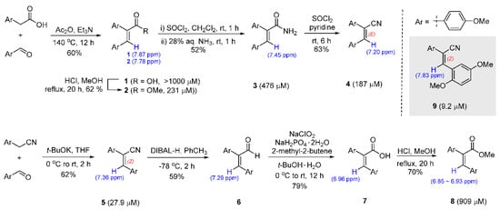 The molecular geometry of the acrylic acid 1 condensed with p-methoxyphenyl acetic acid and p-anisaldehyde in acetic anhydride and trimethylamine was assigned the configuration E, while acrylonitrile 5, the adduct of p-methoxyphenyl acetonitrile and p-anisaldehyde under alkoxide basic condition, was synthesized with the entire Z-isomerism. Further chemical replacement via substitution, reduction, or oxidation was investigated and a few diarylacrylonitrile derivatives (2–8) were prepared. These simple and concise synthetic routes were adopted to obtain the best analog 9 with 2,5-dimethoxybenzaldehyde. The NMR spectroscopic analysis of olefinic hydrogen (colored in blue) is used to distinguish its E/Z geometry [,]; the hydrogen in the Z-configurated olefin appears to be slightly more upfield while the E-geometric hydrogen appears more downfield to the left. Even in this assignment, the comparison of 1 and 7, 2 and 8, and 4 and 5 revealed distinguishable information about the carbon skeletons [].