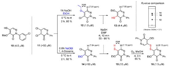 With a starting standard 10, the authors intended to investigate the influence of the position of the thiol moiety and proceeded to develop distinct synthetic methods for regioselective substitution with alkoxide to the α or β position of unsaturated ketone. If the relatively mild reaction condition with 1 N of sodium hydroxide in ethanol proceeded with substrate 11, only β-substituted ethoxide was prepared. However, treatment with ethoxide anion generated in situ 1, 4-dioxane to 11, predominantly providing the α-substituted counterpart. Moreover, the selective characteristics may depend on the length of the alkoxide carbon chain. Thus, their regioselectivities were determined through the nOe analysis between adjacent hydrogens in a molecule; these structural isomers showed their distinguishable identities on TLC analysis, as shown in Scheme 2. The remaining chlorine atoms of 12 and 14 were fairly quickly replaced with thiol 13 and 15 and thiol molecule 15 was oxidized to disulfide 16 in the presence of oxygen gas [,].