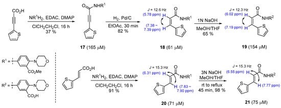 The stereochemistry of E/Z isomers can be elucidated through 1H NMR analysis. On the 1H NMR spectrum, the olefin hydrogens in 18 and 19 have shown different chemical shifts and coupling constants compared to those of 20 and 21. As expected, the apparent coupling constants were smaller in the cis-isomers than the trans-isomers. Further, it has been found that the olefinic hydrogens of the trans-diastereoisomer are located downfield than those of the cis-diastereoisomer to a certain degree.