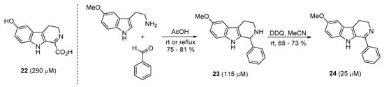 A new heterocyclic skeleton, β-carboline, inspired by the structures of indole-containing natural products, was synthesized by the Oh and Lee group []. With 6-hydroxydihydro-β-carboline (22) as a standard and through a simple and fast synthetic route [,,,], the best inhibitor candidate 24 with an IC50 value of 25 μM was observed. Briefly, condensation between 5-methoxy tryptamine and benzaldehyde followed by ring closure was very smoothly performed according to the Pictet–Spengler reaction, affording the tetrahydro-β-carboline 23. Further, oxidation with the aid of the DDQ reagent resulted in the generation of dihydro-β-carboline 24 with good yield. As depicted in Scheme 4, replacement of carboxylic acid with a phenyl ring induced a marked increase in the inhibitory activity of sortase A.