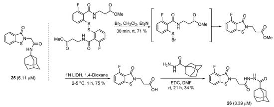 From a small molecule library screening that included over 50,000 drug-like compounds, a new class of sortase A inhibitors, with 25 as a representative, was identified by the Zhulenkovs group []. The skeleton was comprised of benzo[d]isothiazol-3-(2H)-one heterocycle, which might form a covalent bond with the sortase A enzyme, the adamantyl moiety that offers the hydrophobic property, and an adequate linker. Owing to the results of the SAR analysis, the authors synthesized different combinations of the two ring moieties with 4–6 carboned spacers, which ultimately resulted in an IC50 value of ~3 μM (26). The core benzoisothiazolinone structure was prepared with the intermediate, 2-carbamoylbenzenesulfenyl bromide, via the treatment with bromine to disulfide. Additionally, the attachment of the adamantyl functionality was completed through evident EDC coupling (Scheme 5) [,,].