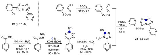 After the acquisition of the hit compound 27 with a 3,6-disubstituted triazole structure, a synthetic optimization was performed by Schneewind, Luo, and Yang group [], with few modifications, to discover the improved activity. The ethyl isonicotinate nucleophilic substitution with hydrazine was observed to occur as planned. Thereafter, isonicotinohydrazide was condensed with carbon disulfide in the presence of potassium hydroxide, producing potassium dithiocarbazate, and a triazole ring was formed upon treatment with hydrazine hydrate. Ultimately, the thiadiazole structure in 28 was achieved with 4-amino-5-aryl-3-mercapto-1,2,4-triazole and the corresponding benzoyl chloride in the presence of phosphorus oxychloride (Scheme 6) [].