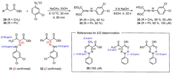 The Maggio and Raffa research group has studied the 1,3-dicarbonyl core skeleton with an aryl hydrazinylidene at the α-position of β-keto ester as a novel class of sortase A inhibitors []. As shown in Scheme 7, the diazonium salt prepared from the substituted aniline was reacted with β-keto ester 29 or 30 [,]. Thereafter, basic hydrolysis was carried out, affording the acids 33 and 34. During the synthesis of a series of analogs of the screened molecule, 35, with an IC50 value of 192 μM, an issue ensued regarding the assignment of the geometry of the C=N double bond for 31 and 32 [,,,]. Through a comparison of the 1H NMR spectroscopic information for the reference molecules, the obtained materials, 31 and 32, were confirmed to be E and Z, respectively [,,]. For the E-configurated molecule, 31, the hydrogen of NH and the oxygen of the acetyl moiety form intramolecular hydrogen bonding, depicting an apparent downfield shift of NH and methyl signals compared to the Z-geometry [,].
