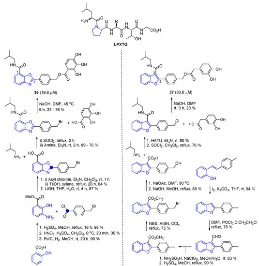 During the search for a new frame of sortase A inhibitors, the Jiang and Fu research group developed L-shaped kinked molecules that mimic the sortase A substrate, LPXTG, sequentially designing 2-phenyl-benzo[d]oxazole-7-carboxamide and 2-phenyl-benzofuran-3-carboxamide [,]. Sortase A is known to recognize the LPXTG sorting signal (X means any amino acids) which is arranged in an L-shape mode by the L (Leu) and P (Pro) residues. The authors introduced an isobutyl amide functionality at the C-7 position of benzo[d]oxazoles and the C-3 position of benzofuran. Further, the core bicyclic rings were regarded as the displacement of pyrrolidine, and a right-side assembly of carbons and oxygens was expected to produce some spatial effect, mimicking the X amino acids in the substrate. The constructive methods of the objects are described in Scheme 8 [].
