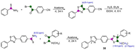 A study on the structural investigation of sortase A inhibitors through Bemis–Murcko scaffold analysis revealed that the scaffolds preferred for sortase A inhibitors contain at least two ring systems bonded directly or merged in a condensed cycle (Scheme 9). The Araniciu and Palage group designed a new framework of five aromatic rings linked directly and inspired by Bemis–Murcko clustering, ultimately synthesizing a series of 2-phenyl-thiazole derivatives 38 []. Briefly, thiobenzamide and 4-(2-bromoacetyl)benzonitrile were intramolecularly cyclized in one pot, affording the key intermediate, 4-(2-phenylthiazol-4-yl)benzonitrile. Treatment with hydrogen sulfide gas under triethylamine condition transformed nitrile into thioamide via a further thiazole ring formation reaction. Structures of the molecules were confirmed based on the distinct hydrogen signals on the 1H NMR spectra and sharp signals between 3111 and 3103 cm−1 on the IR spectra []. Although the authors have not demonstrated the IC50 values of these sorts of new inhibitors, the antimicrobial activity evaluation showed that the potential scaffold has reduced activity against bacterial cell viability.